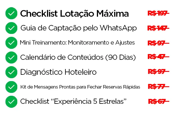 O Checklist Lotação Máxima já ajudou dezenas de donos de pousadas e hotéis a saírem da dependência das plataformas e lotarem suas hospedagens com reservas diretas.